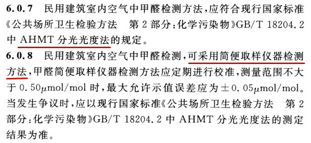 甲醛檢測允許使用經過定期校準的便攜式檢測儀進行檢測,當發(fā)生爭議時,應以現(xiàn)行國家標準GB/T18204.2中AHMT分光光度法的測定結果為準。