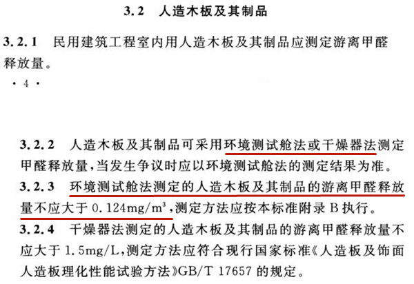 對室內裝飾裝修設計提出了污染控制預評估要求及材料選用具體要求,為室內污染治理企業(yè)開展事前治理提供了新的方向。以人造板為例,規(guī)定其甲醛釋放量不應大于0.124㎎/m3,材料甲醛釋放量檢測采用人造板甲醛釋放量測定的環(huán)境測試艙法和干燥器法。