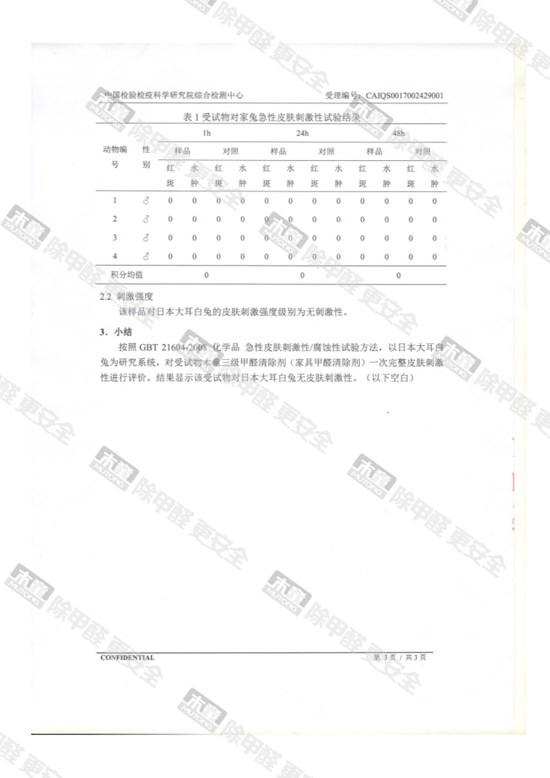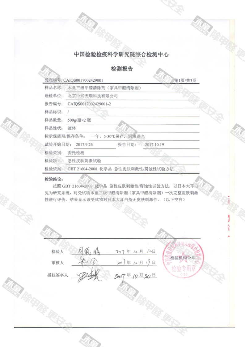 木童家具甲醛清除劑皮膚安全性檢測報告